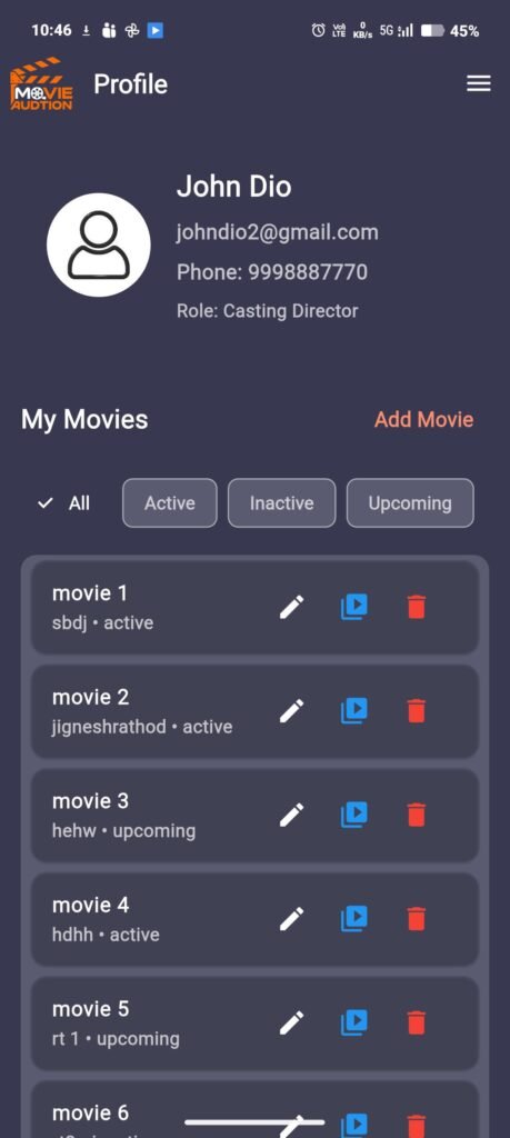 A modern mobile app for online movie auditions, casting management, and talent discovery.
